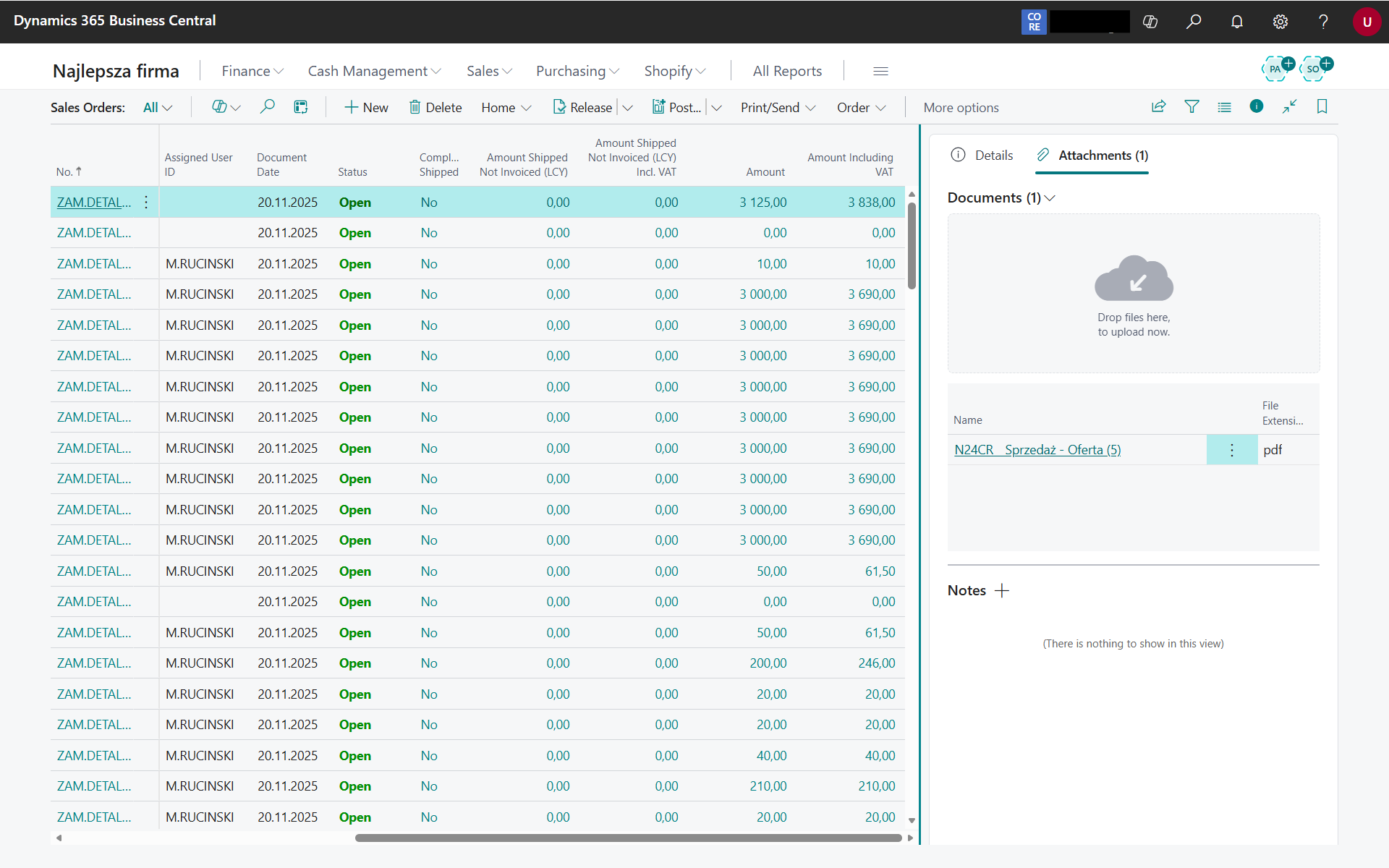 The module adds a dedicated file drop zone to the standard Attachments panel (FactBox) in Business Central. It works on all pages where this panel is embedded — including Sales Orders, Purchase Orders (both Cards and Lists), Customer and Vendor cards, and more.