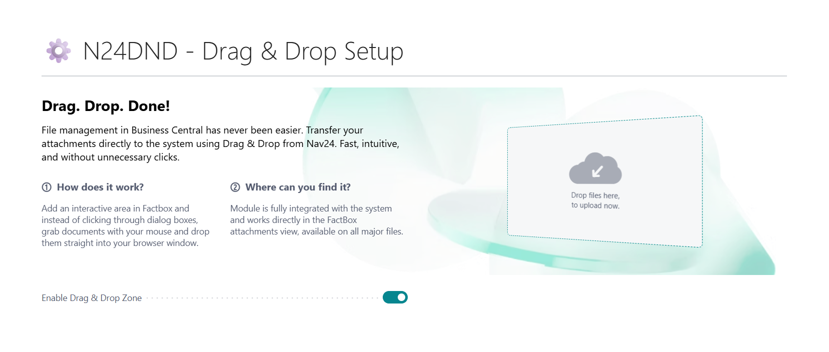 - Open the ⚙️ N24DND - Drag & Drop Setup page using the Tell Me (Search) feature in BC.