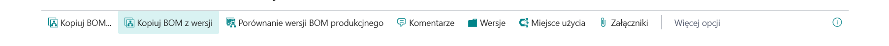 Dodatkowa akcja na liście oraz kartotece BOM-ów: Kopiuj z wersji (obok standardowego Kopiuj BOM) umożliwiająca skopiowanie konkretnej wersji do innego BOM-u.