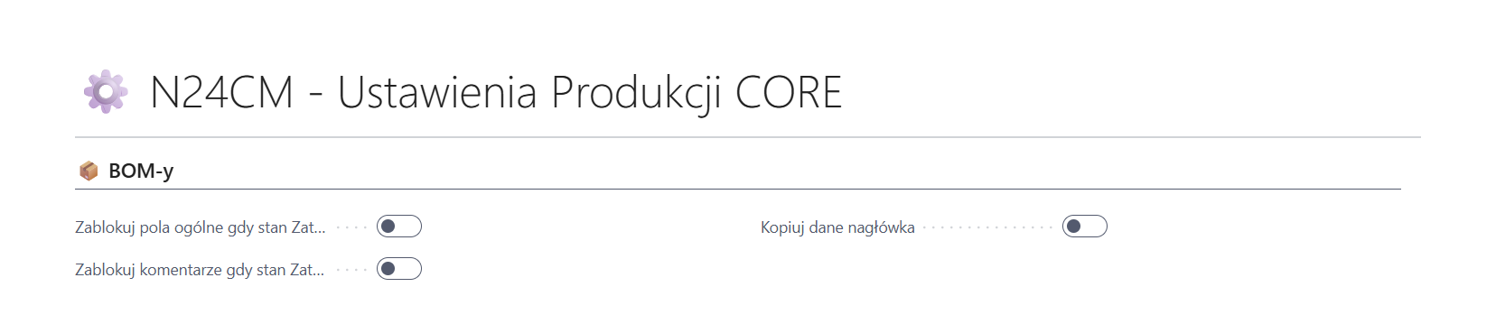 Gdy włączone, system kopiuje również dodatkowe dane nagłówka BOM-u (np. opisy) podczas operacji kopiowania. Opcję można włączyć w ⚙️ N24CM - Ustawienia Produkcji CORE.