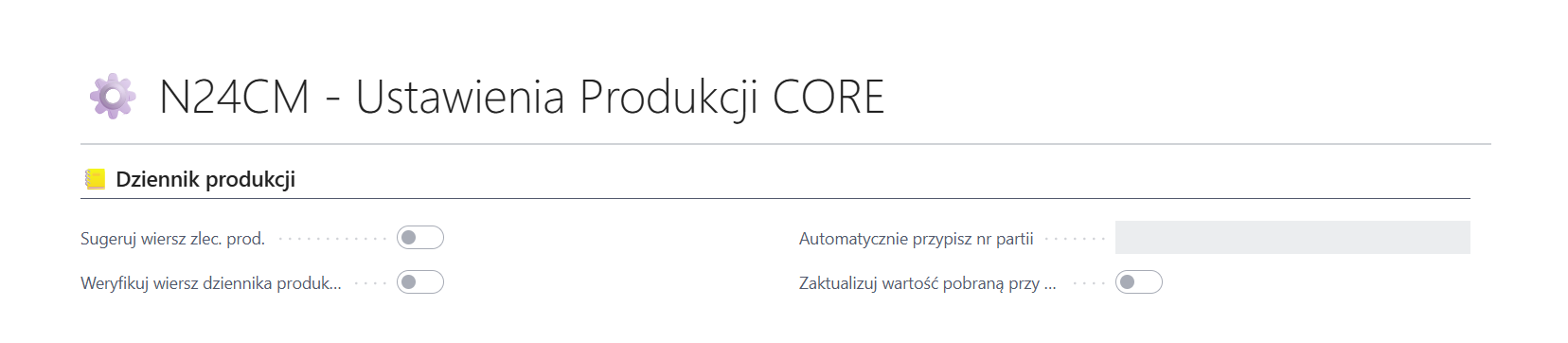 Podczas uzupełniania Nr zlecenia w dzienniku produkcji system zasugeruje pozostałe dane w przypadkach gdy Zlecenie produkcyjne zawiera tylko jeden wiersz. Funkcję należy włączyć w ustawieniach ⚙️ N24CM - Ustawienia Produkcji CORE.