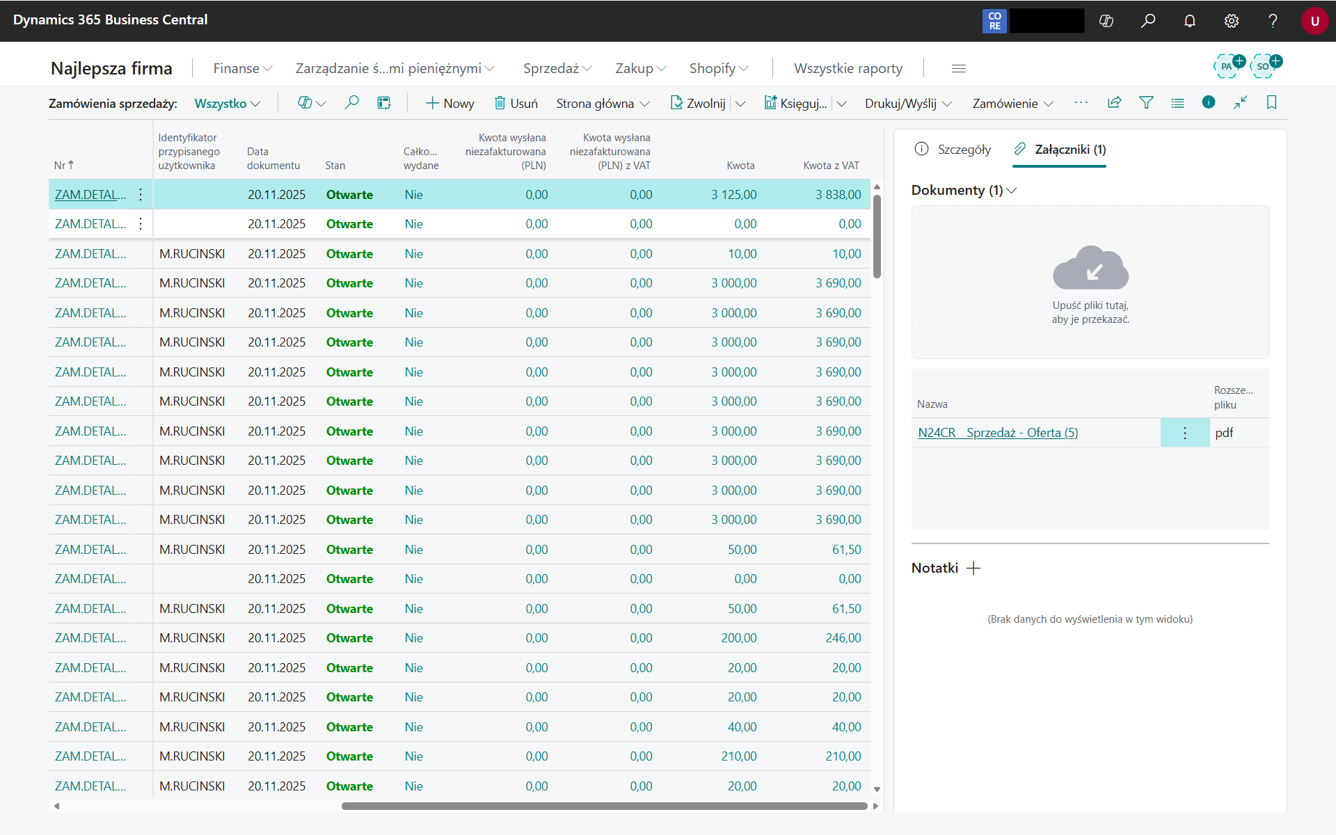 Moduł dodaje strefę przeciągania plików do standardowego panelu Dokumenty (Factbox) w Business Central. Działa na wszystkich stronach, na których panel ten jest osadzony — m.in. na kartach i listach zamówień sprzedaży, zamówień zakupu, kartotek klientów, dostawców i innych.